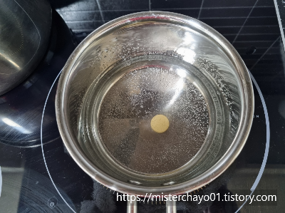 먼저 코인 육수 1개를 넣고 물 500ml (라면 1개 물) 끓이면서 코인육수를 싹~ 녹입니다.