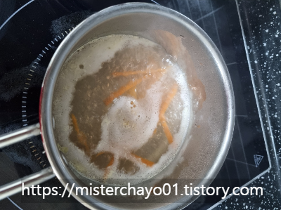 2. 코인이 녹고 나면 당근을 넣어서 끓여요(당근의 맛이 국물에 녹아요)