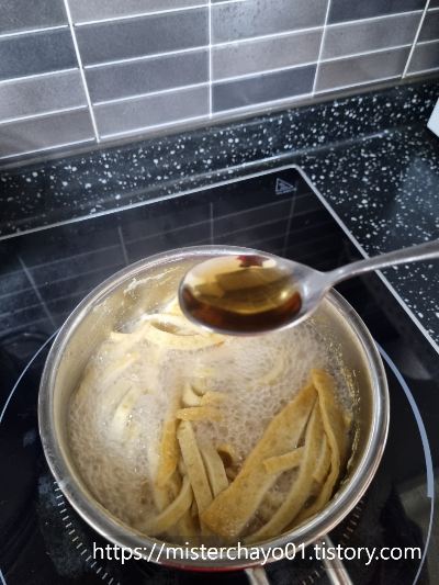 4. 어묵이 불어서 부피가 커지는게 보이면 참치액전 1.5 큰 숟가락 넣어요.